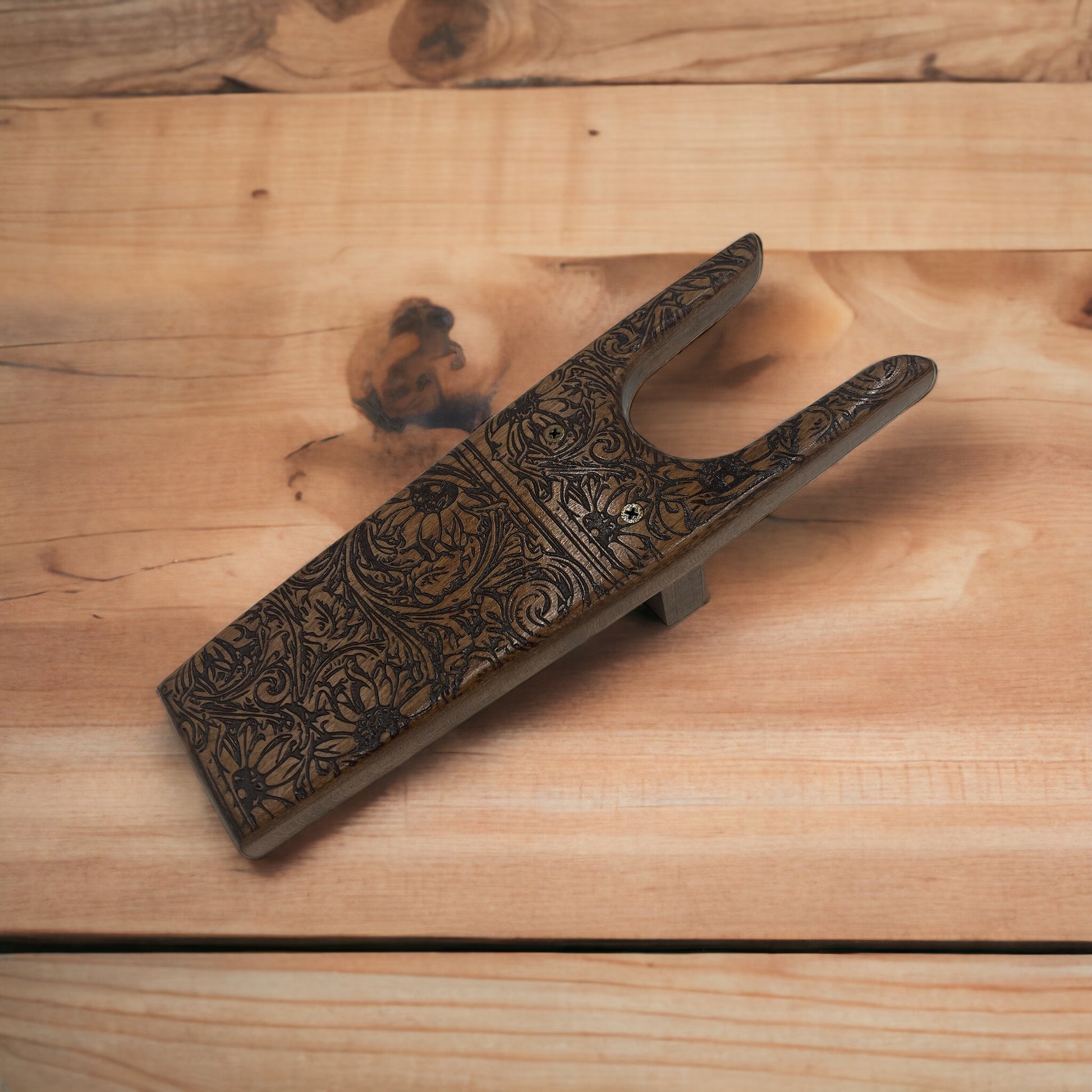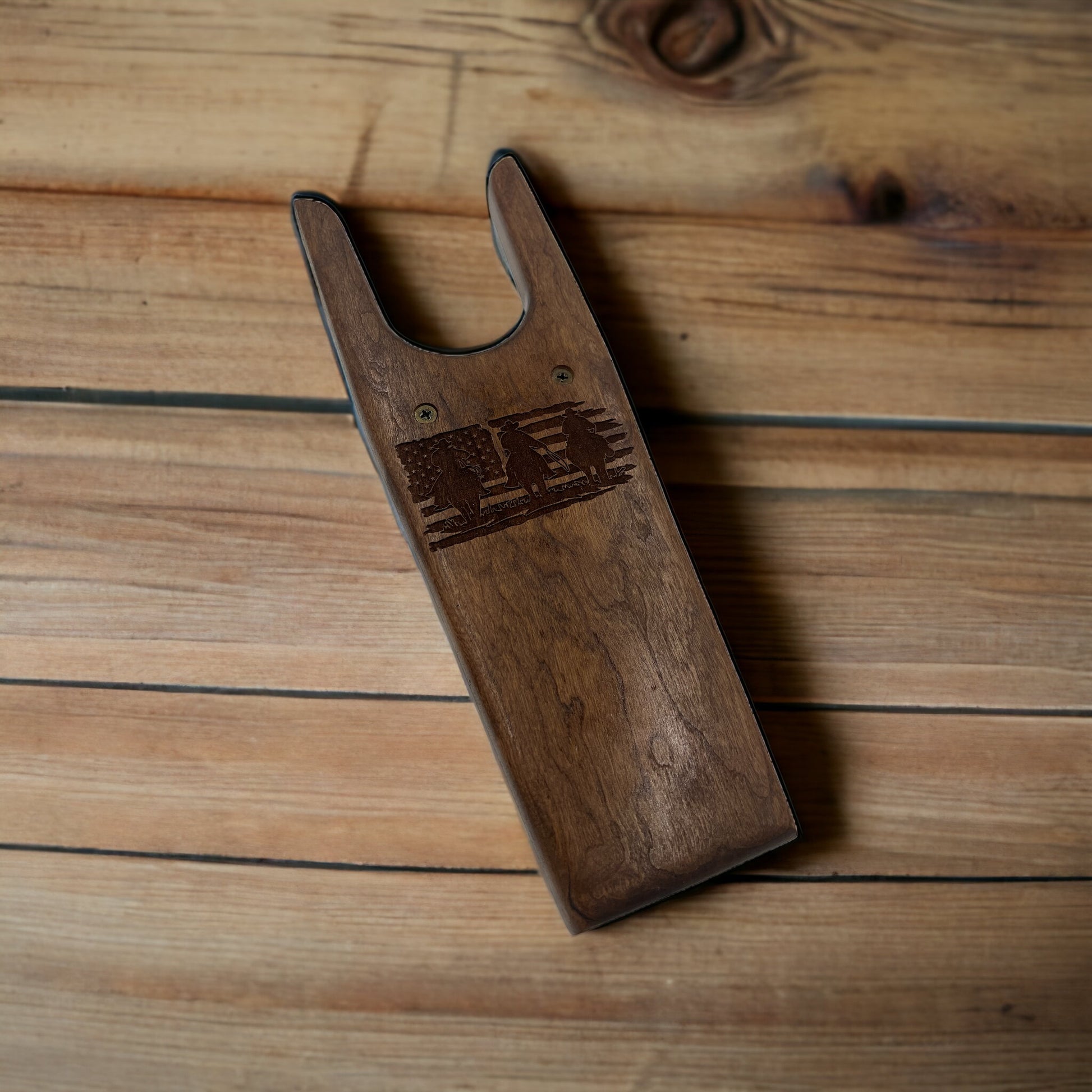Custom-made Boot Jacks made from Cherry wood. Fits up to size EE width boots. Available in Walnut and Dark Walnut stain. Natural finish available upon request. Custom laser engraving is available at an additional charge. For custom engraving, please contact us via phone or email.