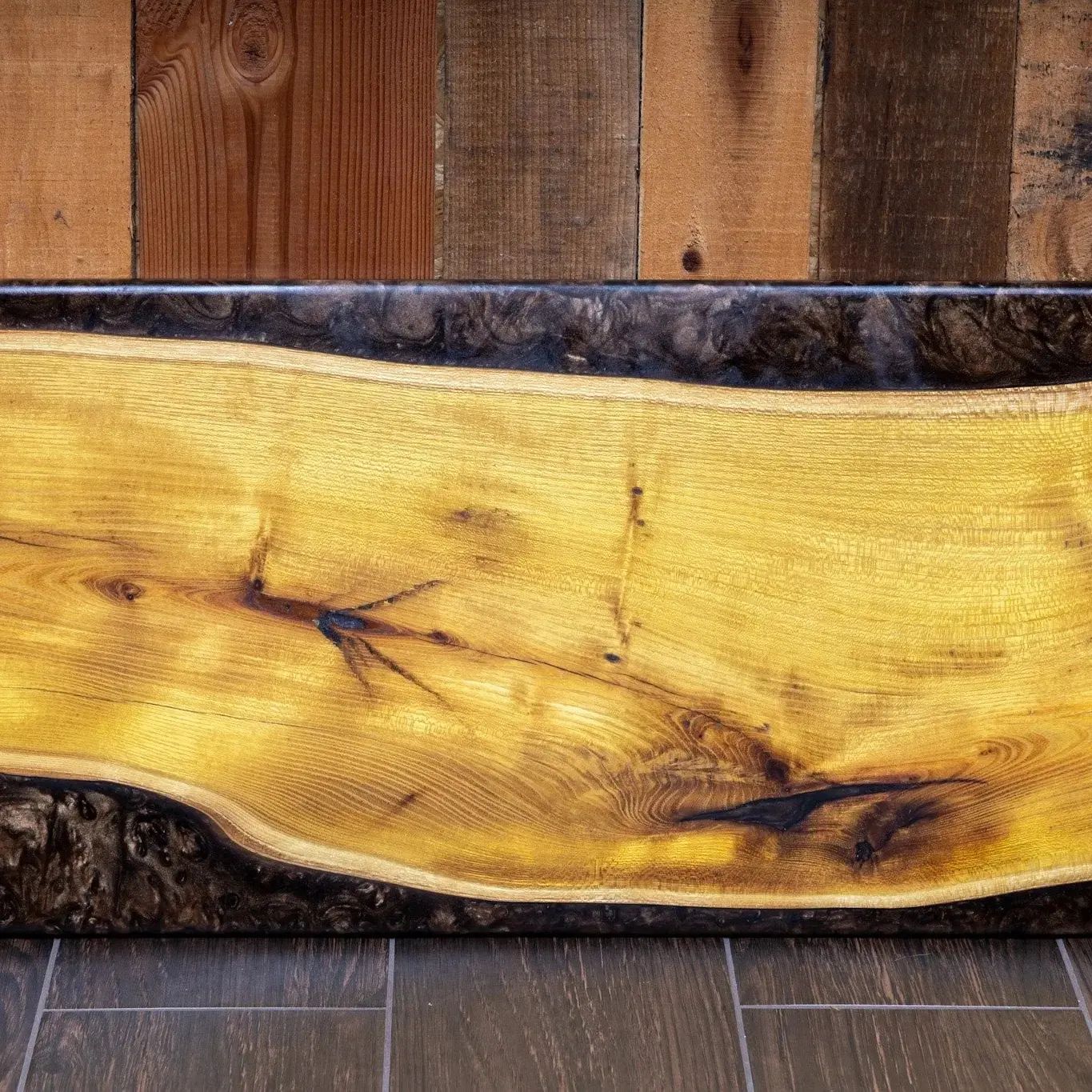 The "Dirty Coppa". Osage orange charcuterie board with onyx black and copper epoxy. All of our boards are finished with food grade/FDA approved products
