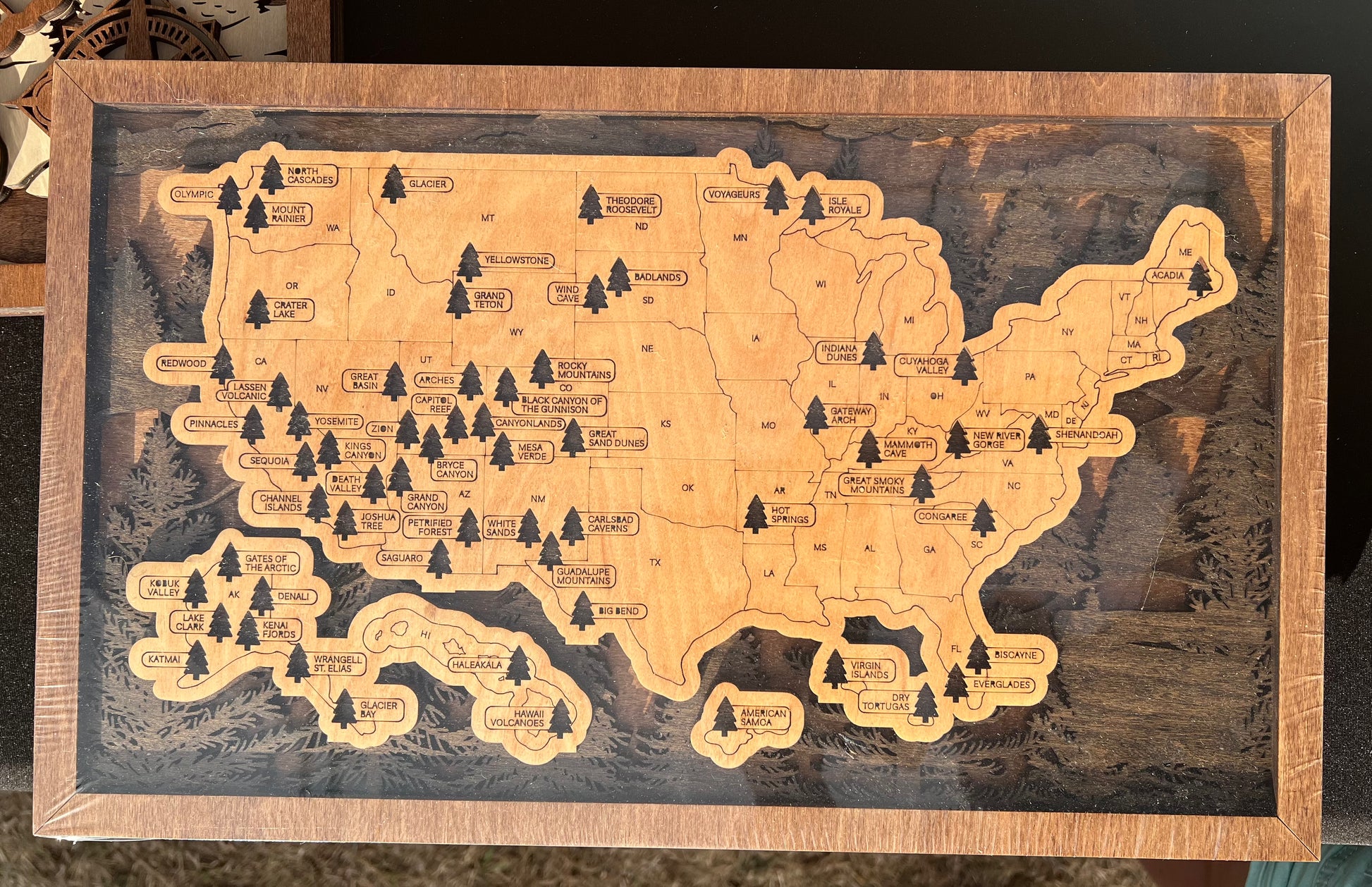 Made to order National Park Map! Insert the included trees as you visit each park! Colors can be customized. Specify color choices in message box at check out if you would like to customize!