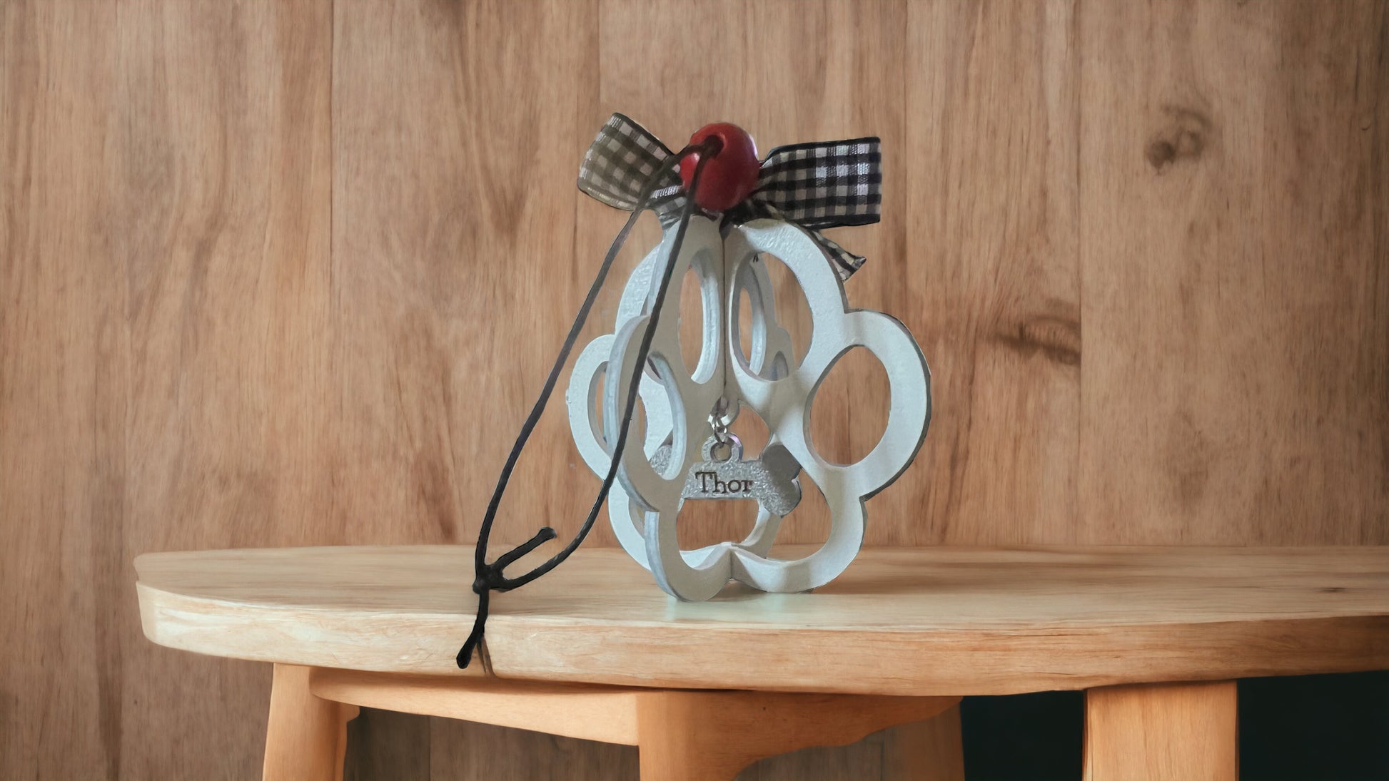 Wood 3D paw print ornament.  Dangling bone charm can be etched with your pet’s name!   Please specify pet name in the special instructions box at checkout!