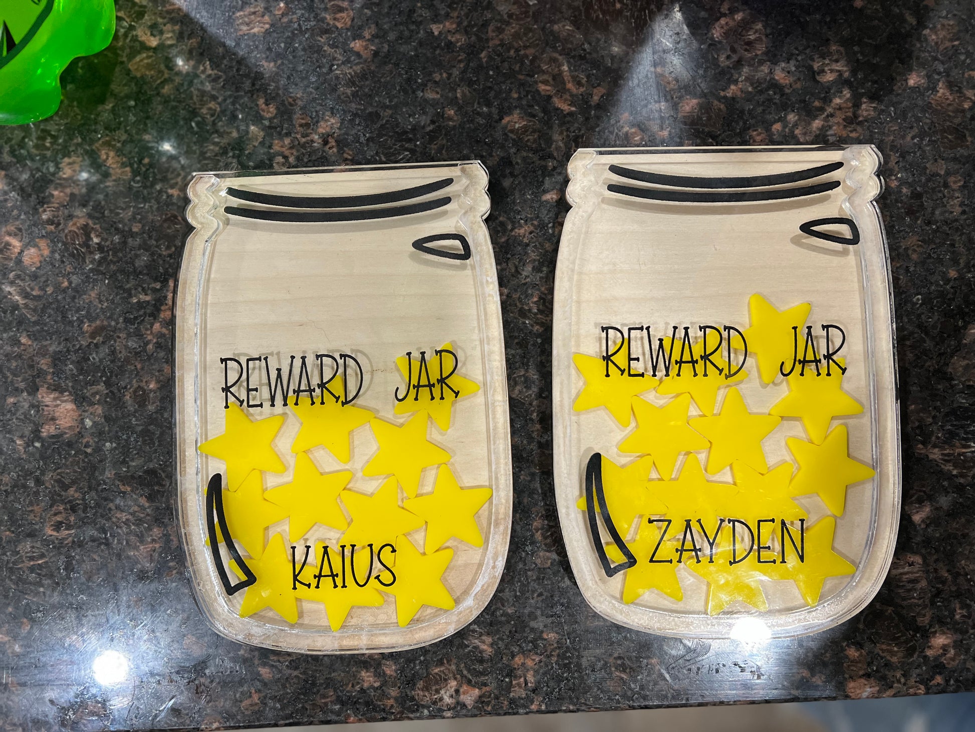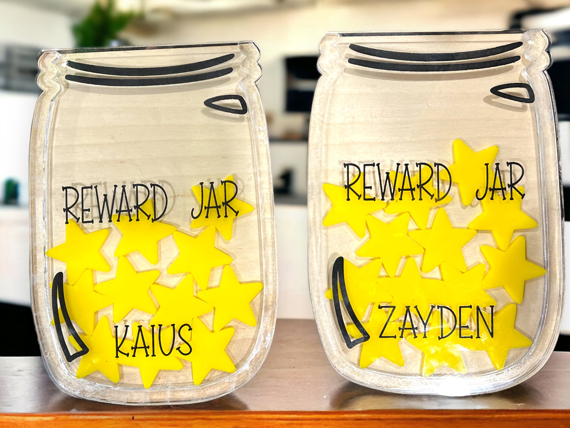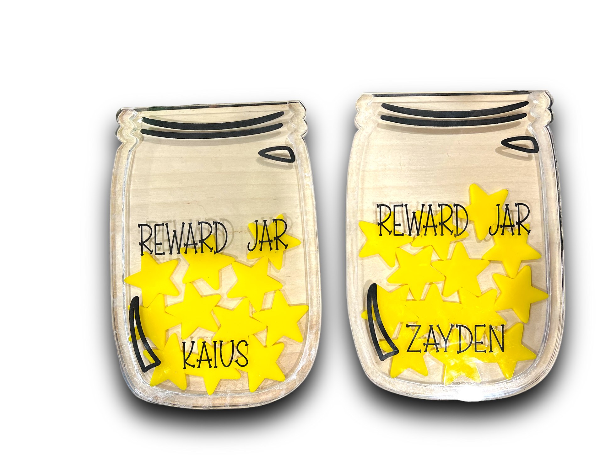 Acrylic and wood reward jars personalized with your child’s name or your classroom. 8.5” x 5.5”. Comes with a set of 20 -2” acrylic stars, your choice of color. Can have magnets on the back or a stand to place jars on. Please note the color choice in the special notes box.