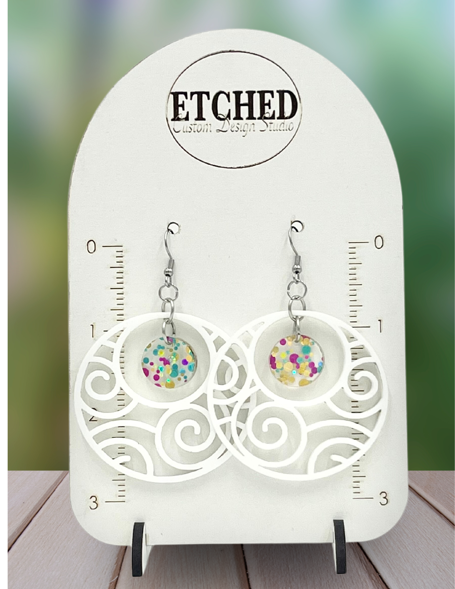White and confetti pattern acrylic earrings. Hypoallergenic surgical stainless steel earring hooks.
