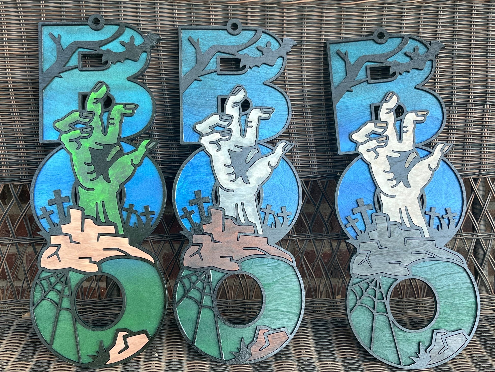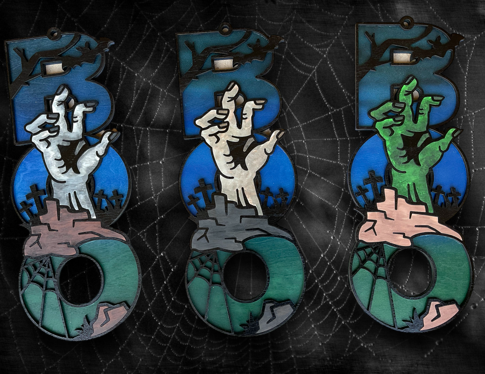 Zombie Hand ”Boo” multi-layer wood hanging sign. Can be hung on wall or front door! Letter color can be customized!! Please note color choice in the special comments section at check out! 20” long